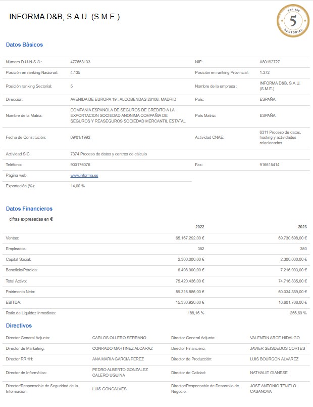Con Duns 100.000 podrá organizar su actividad comercial segmentando las empresas por volumen de negocio, por actividad, o a nivel territorial (provincia, población, código postal). Consulte los datos clave de una empresa antes de acudir a la visita comercial, puede consultar e imprimir el informe de una empresa tantas veces como necesite sin coste adicional. En el informe de cada empresa encontrará los siguientes datos: